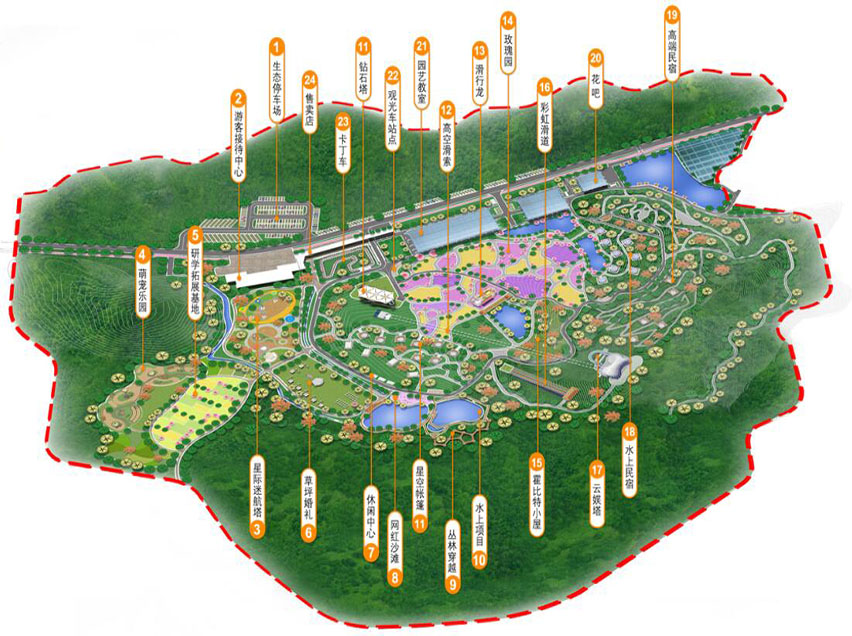 2.本分為游客服務(wù)區(qū)、一期停車場、休閑游樂區(qū)、研學(xué)科普區(qū)、花海觀光區(qū)、野奢民宿區(qū)、運(yùn)動探險區(qū)、二期停車場、山體燈光秀等9個區(qū)。